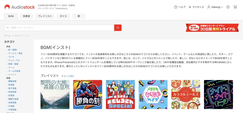 海外発の定額制サービス。おしゃれな洋楽系BGMや効果音が豊富で、YouTuberや映像クリエイターに人気です。商用案件でも安心。